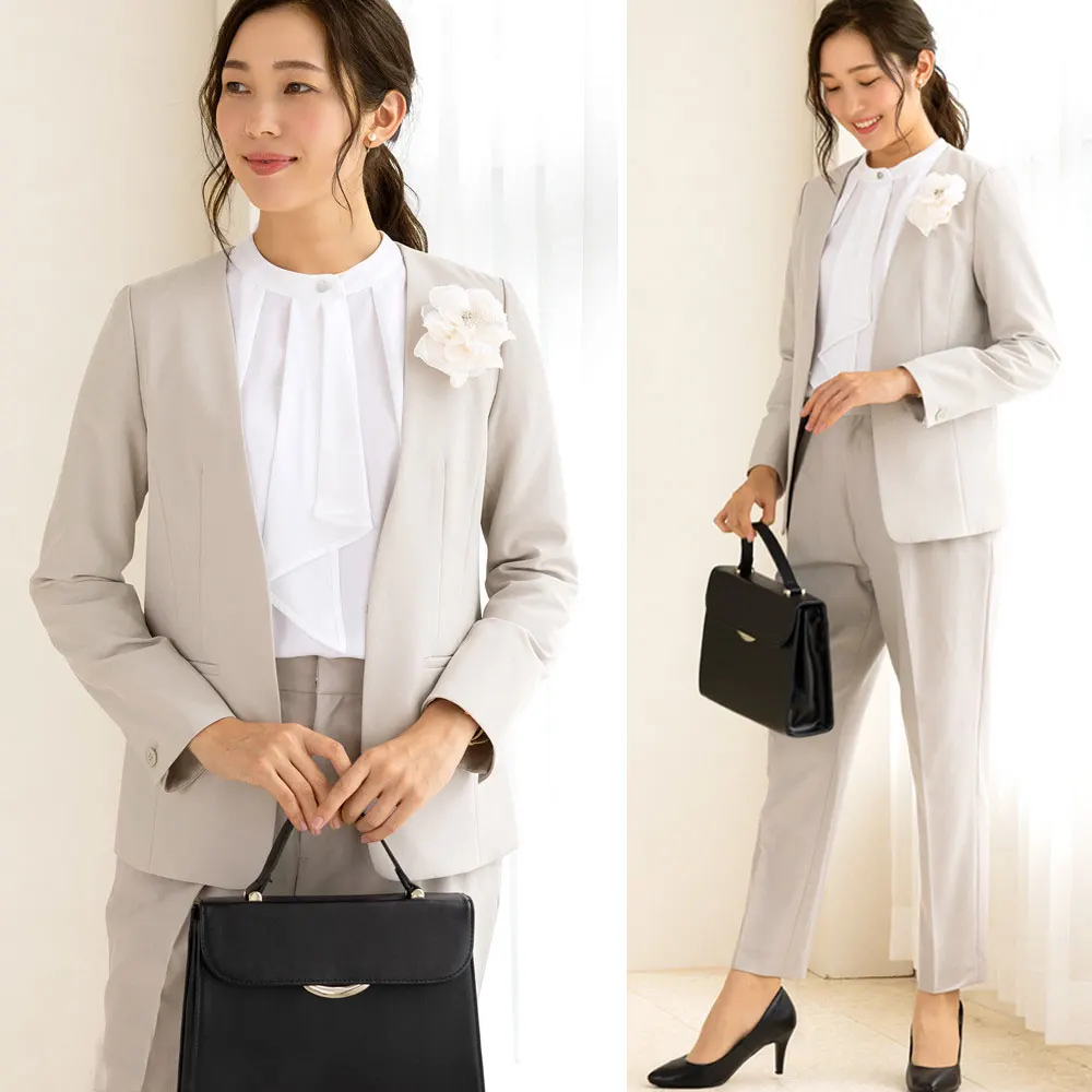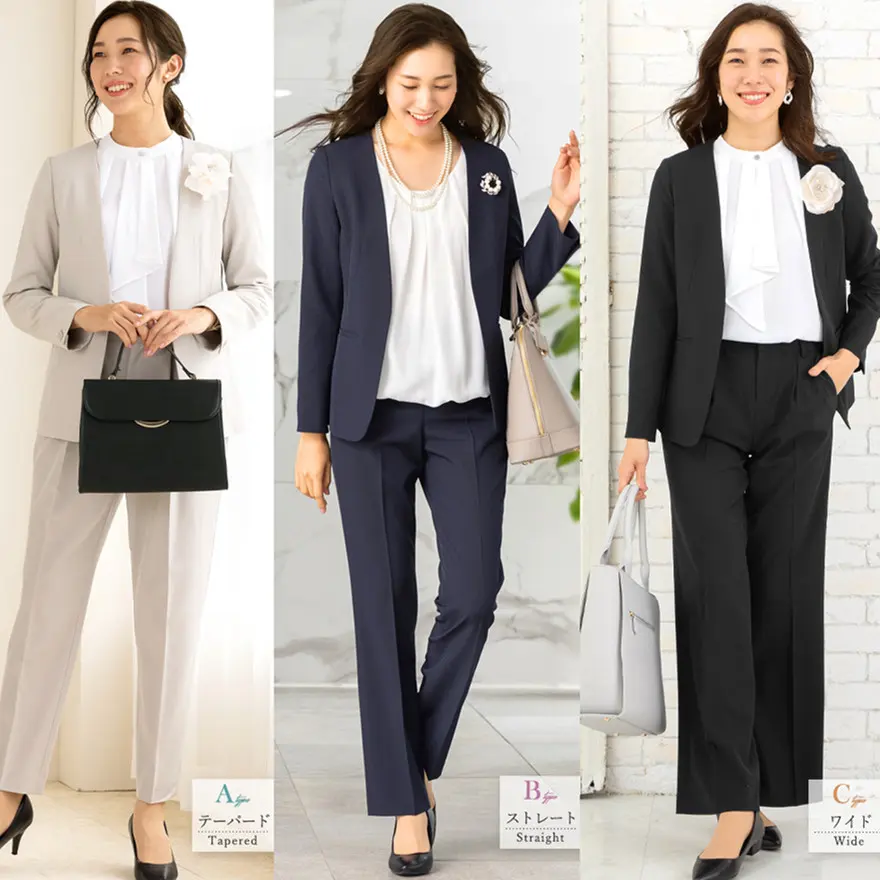 | ジャケットサイズ(cm) | 肩幅 | 袖丈 | 着丈 | バスト | テーパードパンツサイズ(cm) | ヒップ | ウエスト | 裾幅 | わたり幅 | 股上 | 股下 | ストレートパンツサイズ(cm) | ヒップ | ウエスト | 裾幅 | わたり幅 | 股上 | 股下 |